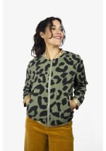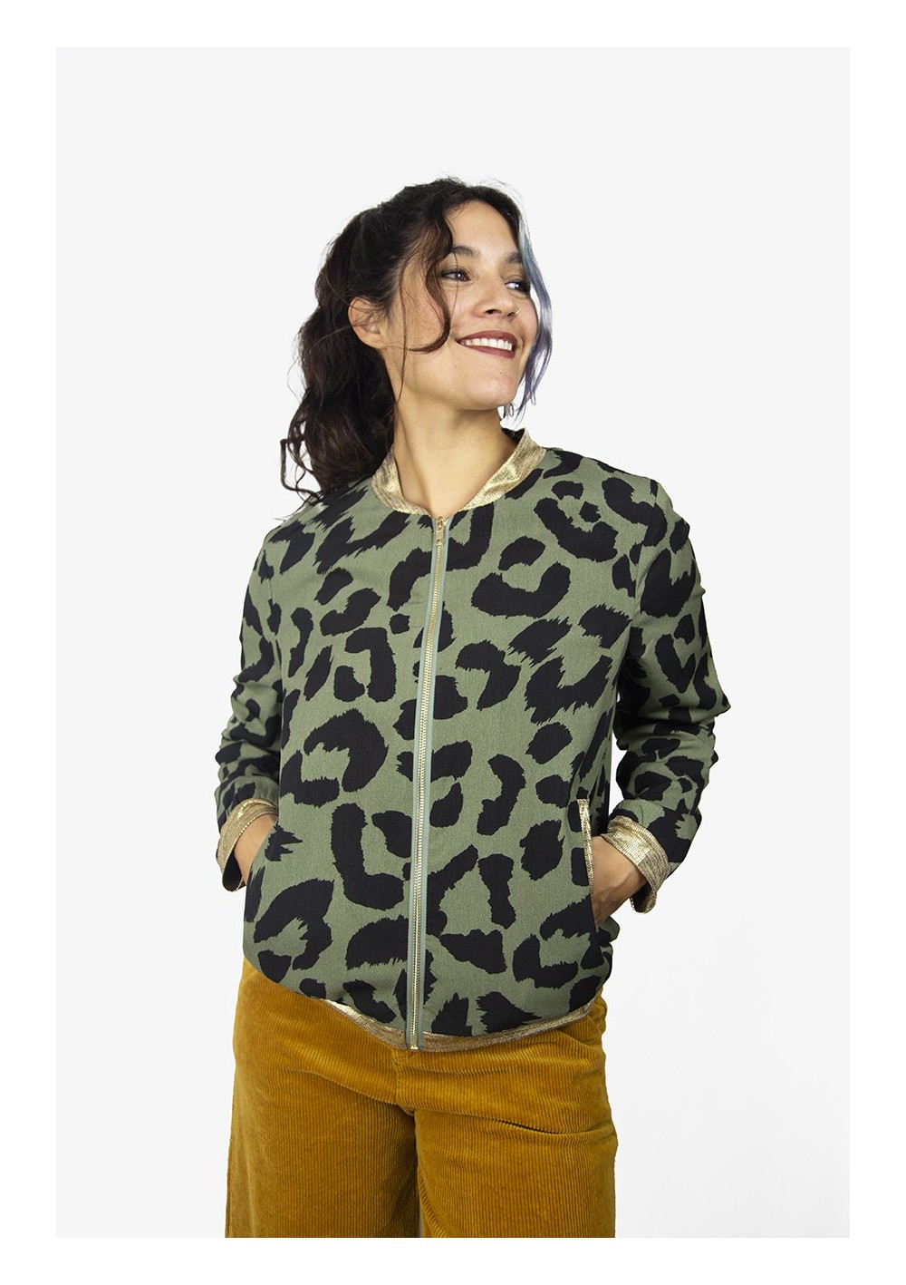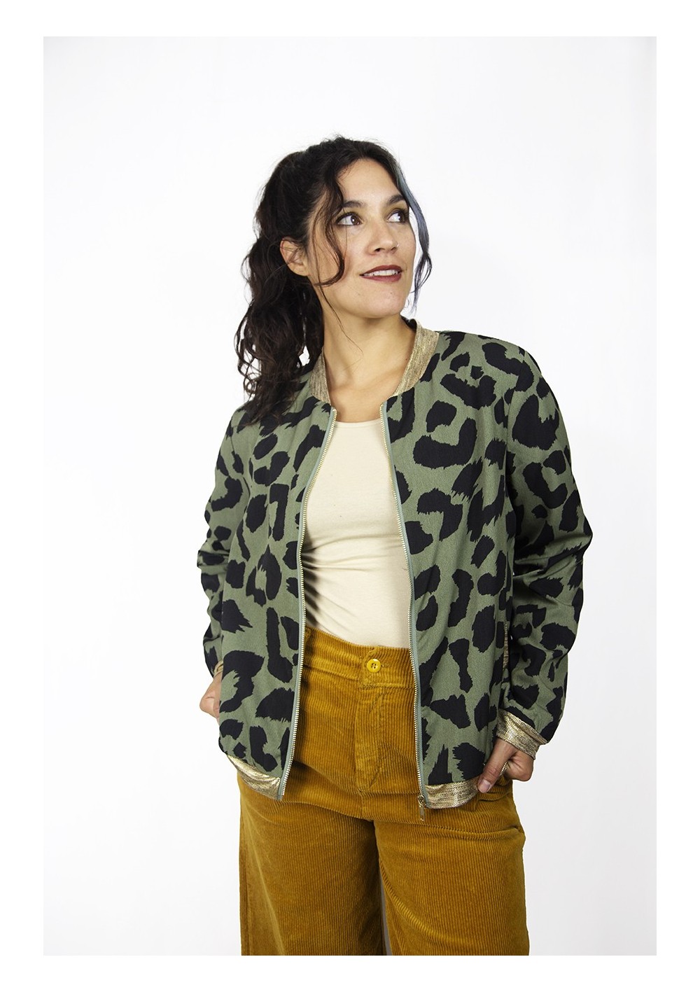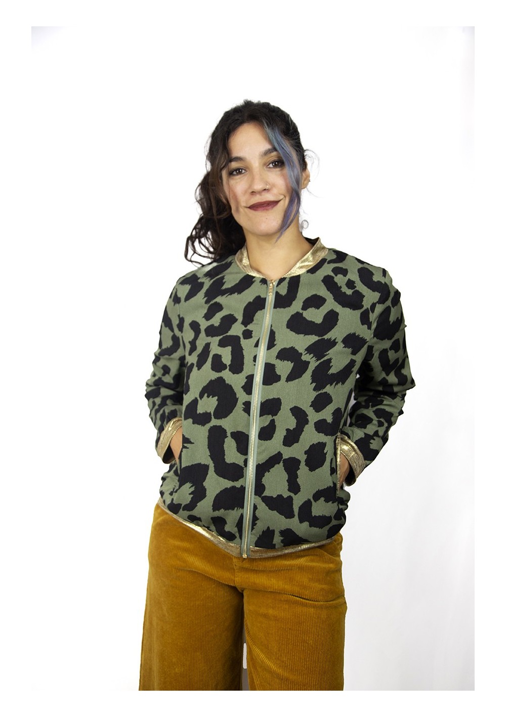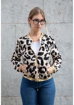 Bomber forrada. Tejido ligero. Diseño estampado. Cuello, cadera, puños y bolsillos en punto elastizado a contraste en oro metalizado. Cierre delantero con cremallera color oro.