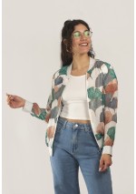 Bomber forrada. Tejido ligero. Diseño estampado con perfil dorado bordeando las hojas. Cuello, cintura y puños en punto elastizado a contraste en blanco metalizado. Cierre delantero con cremallera color plata.
