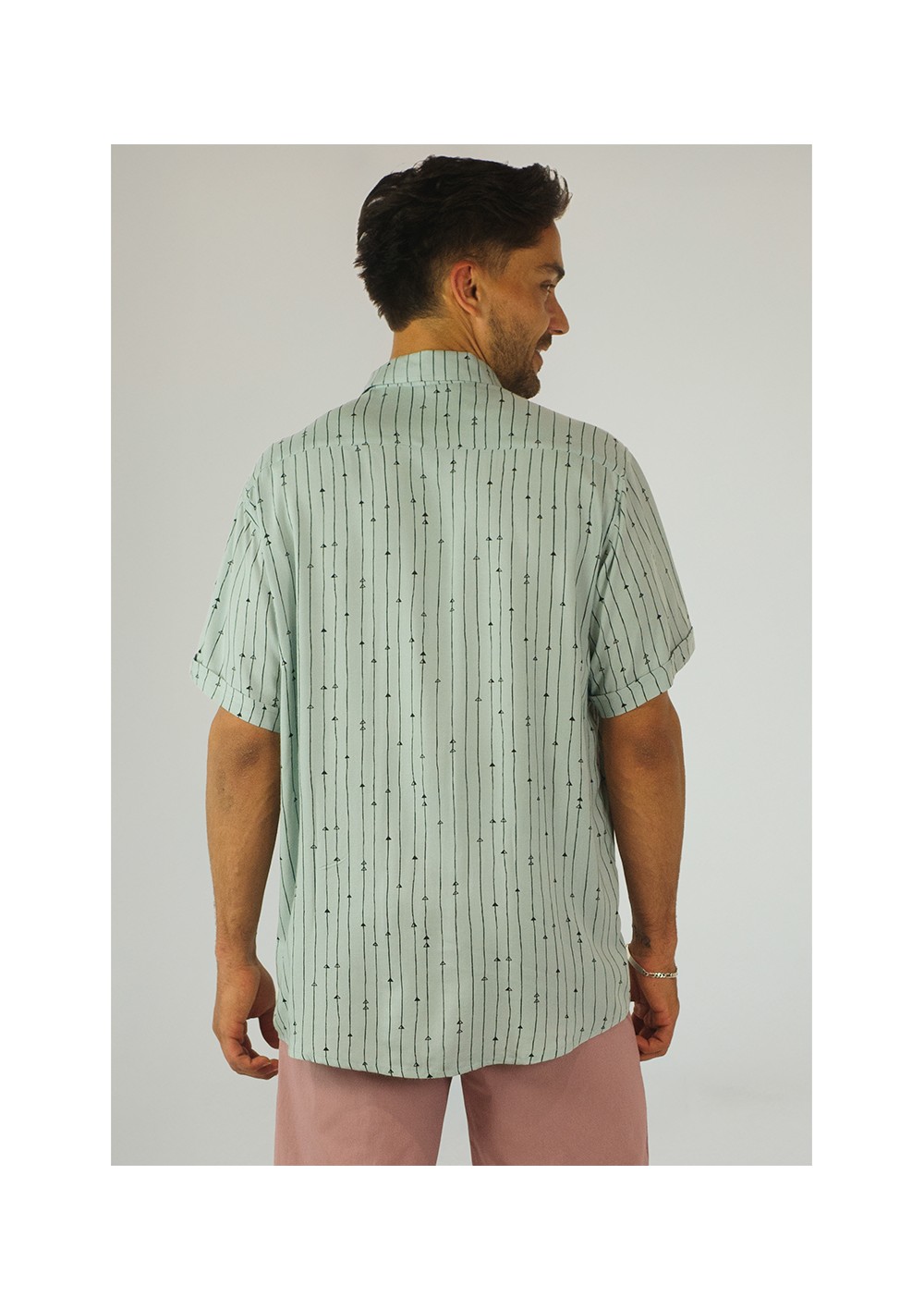 Fit Regular. Diseño mini estampado de flecha vertical en fondo gris perla. Canesú trasero. Cierre delantero con botones.