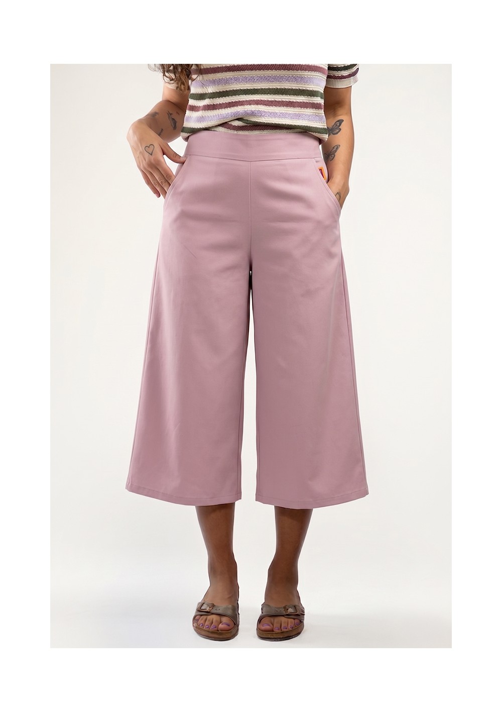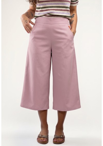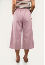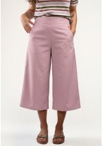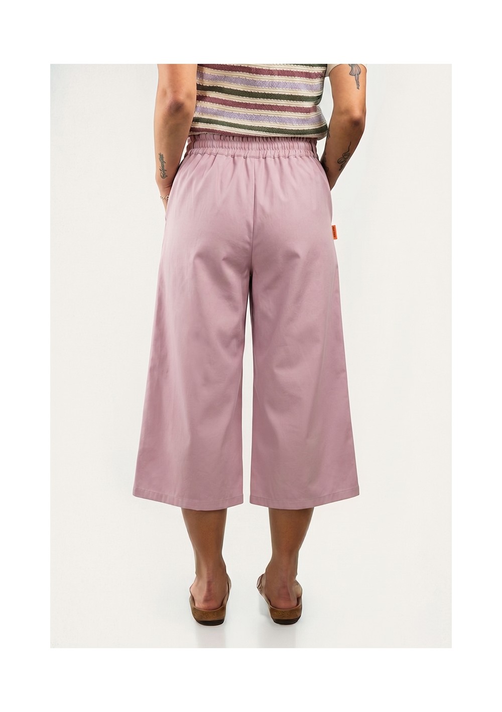 Pantalón culotte de tiro alto y cinturilla estructurada con detalle plisado superior. Pierna amplia. Largo al gemelo en sarga de algodón. Bolsillos laterales. Cierre con cremallera lateral. Cinturilla trasera elastizada. Talla única.