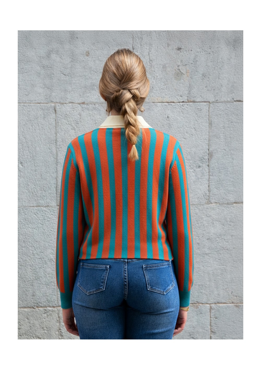 Jersey de punto. Diseño estampado de rayas. Fit oversize. Polo de manga larga. Largo a cadera. Manga caída. Corte boxy. Cuello camisero y tapeta frontal en beige con botones forrados.