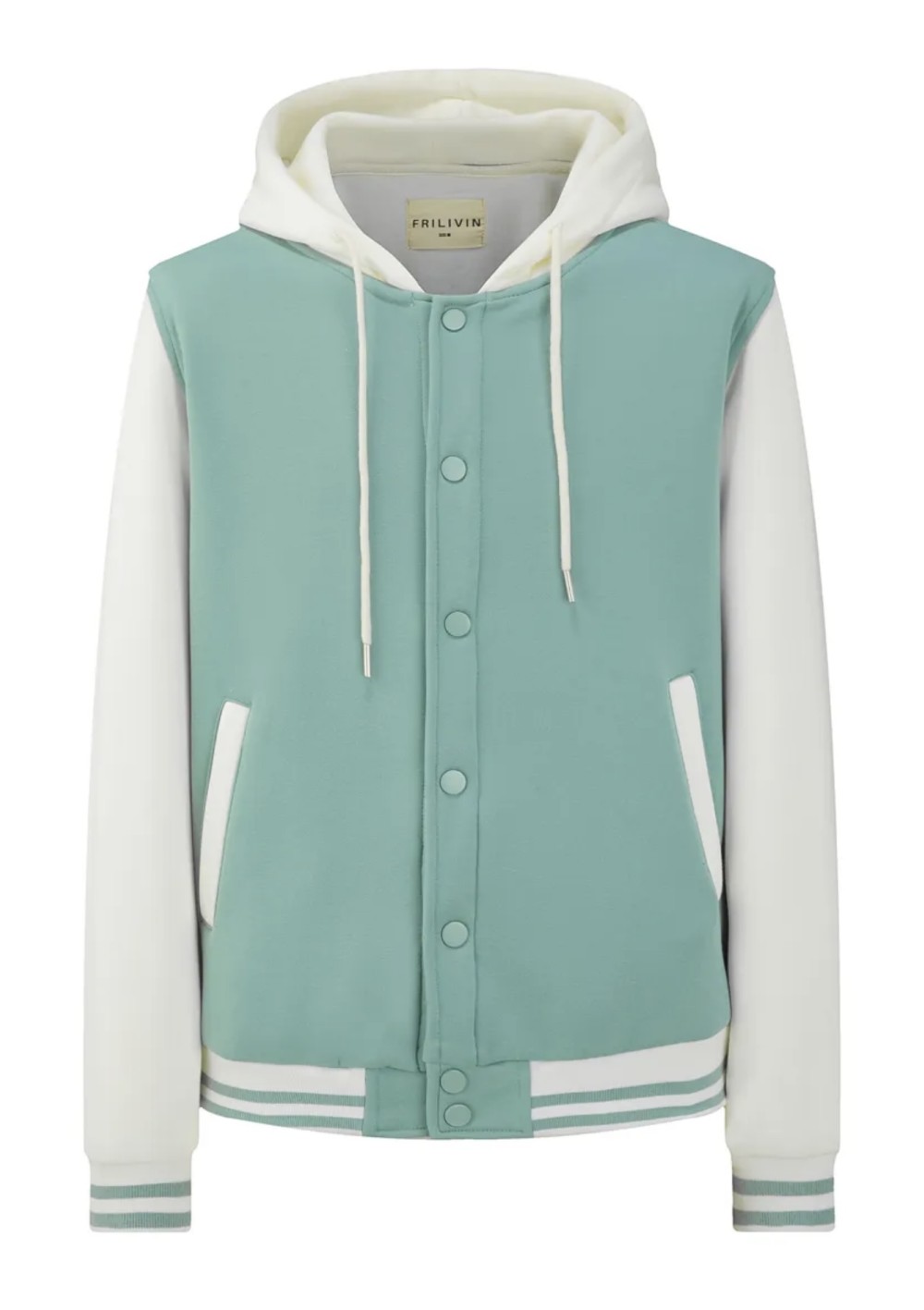 Sudadera tipo college combinada delate y detrás en verde. Mangas, capucha y vistas bolsillos en beige. Puños y cadera en punto elastizado a contraste con diseño a rayas en color verde sobre fondo beige. Cierre delantero con broches de presión color verde mate.