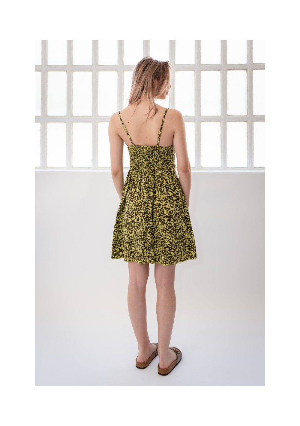 Vestido estampado en tejido ligero con escote pronunciado en V y mini volante en borde. Tirantes regulables. Esapalda elastizada con nido de abeja. Corte debajo del pecho. Detalle de 3 botones decorativos. Busto forrado. Bolsillos laterales