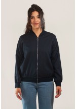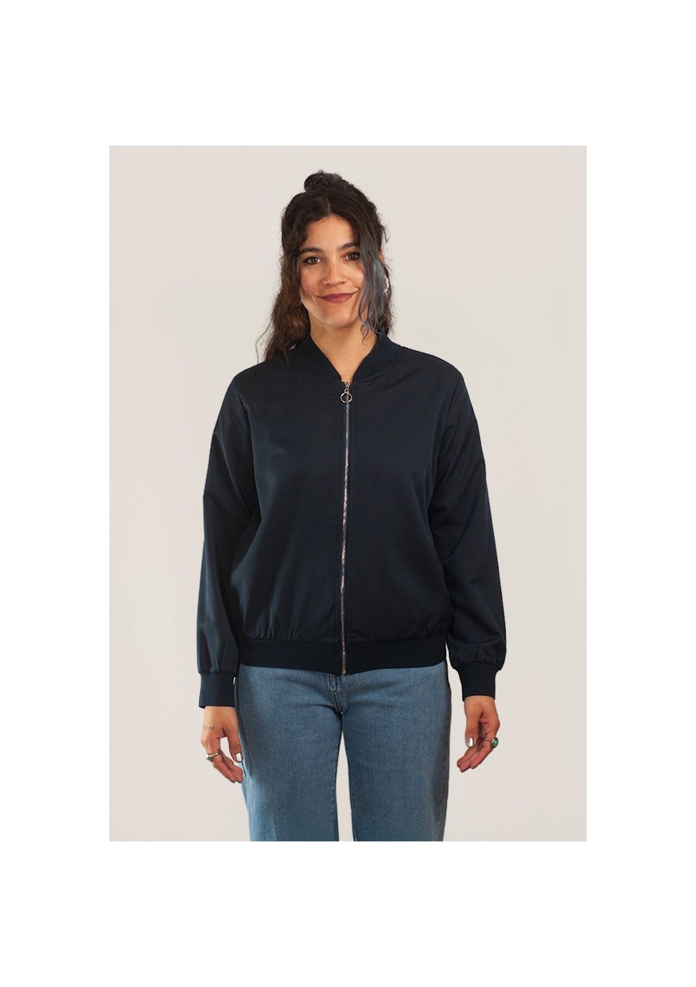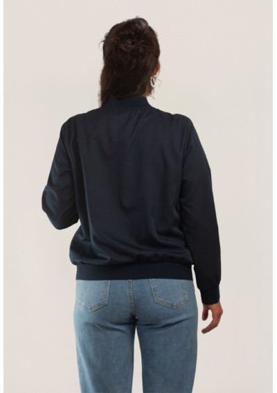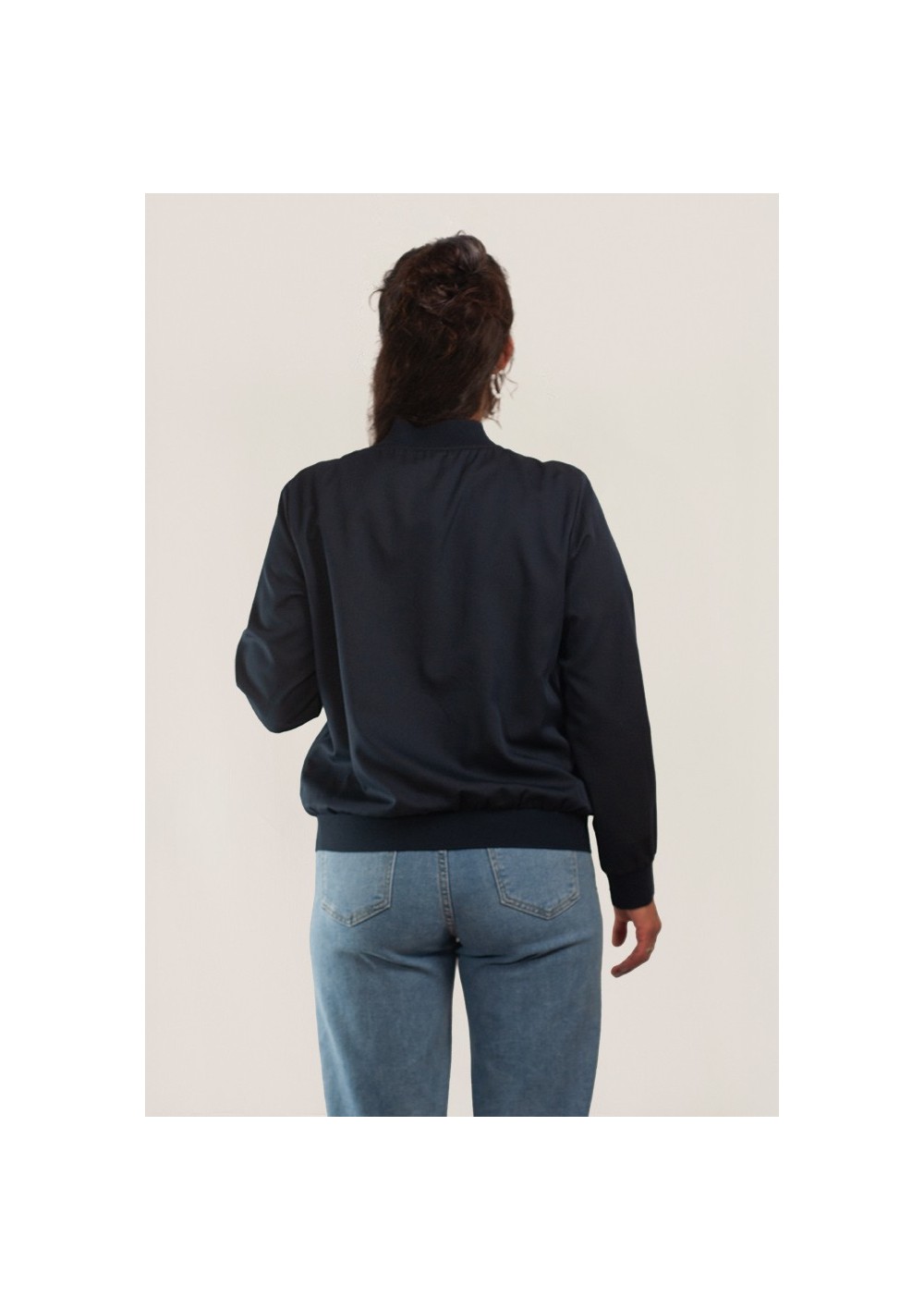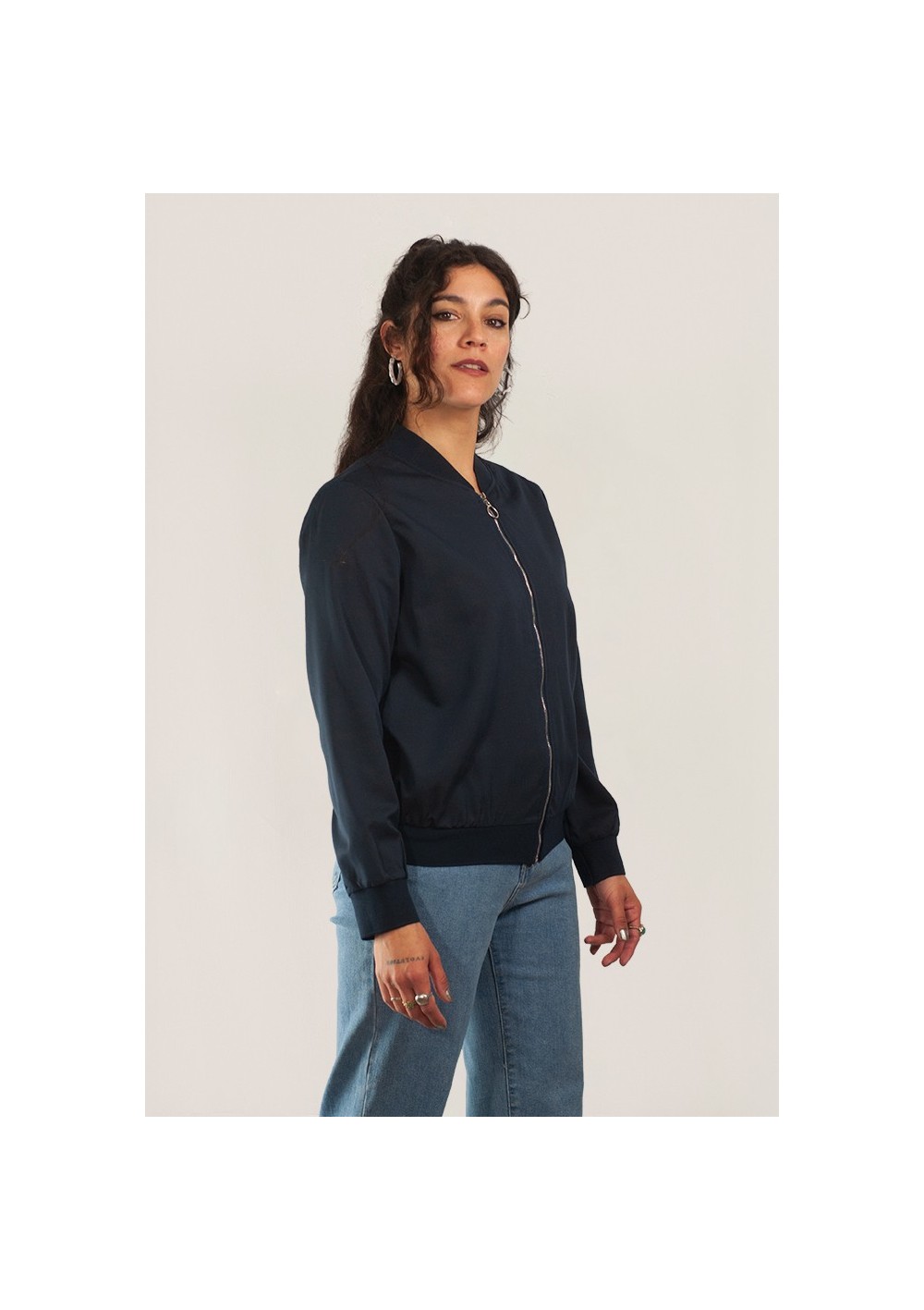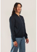 Blouson aviateur léger. Col, ourlet et poignets en maille stretch bleu métallisé.