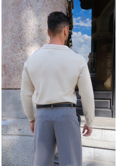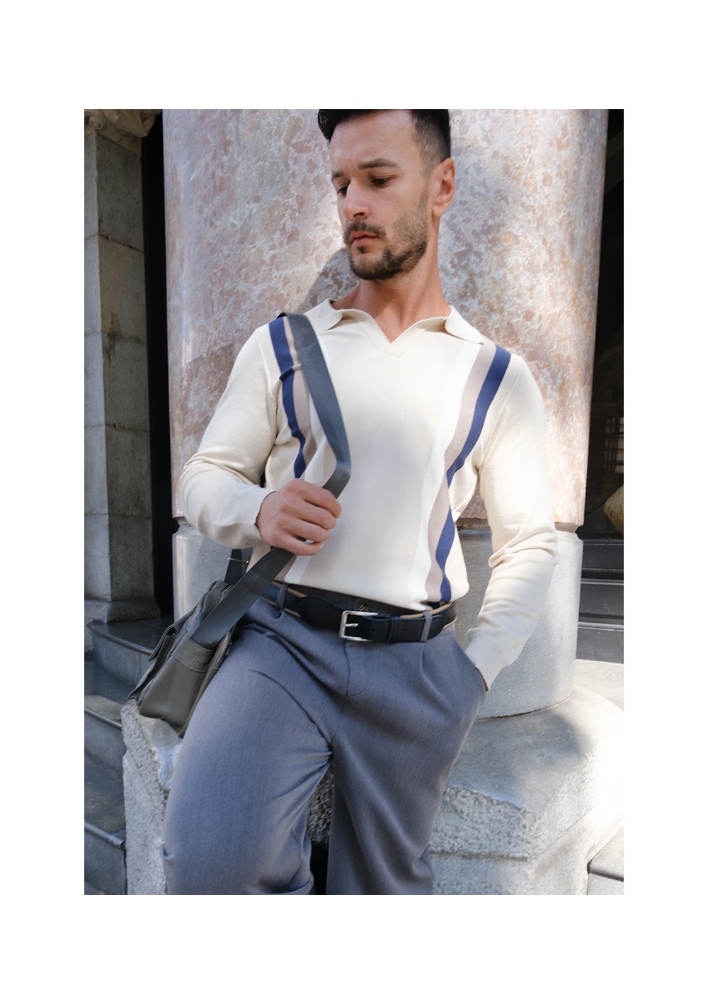 Polo coupe classique. Col en V ouvert. Rayures verticales parallèles sur les côtés.