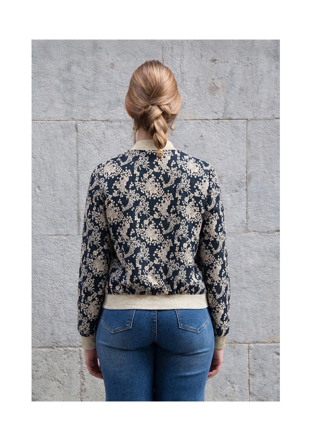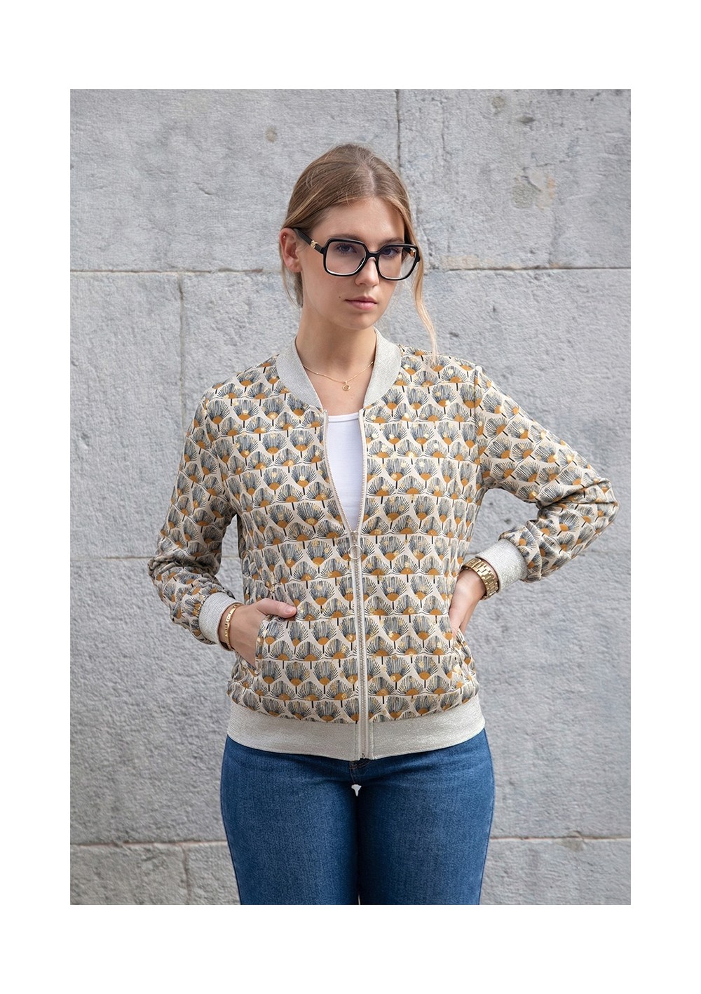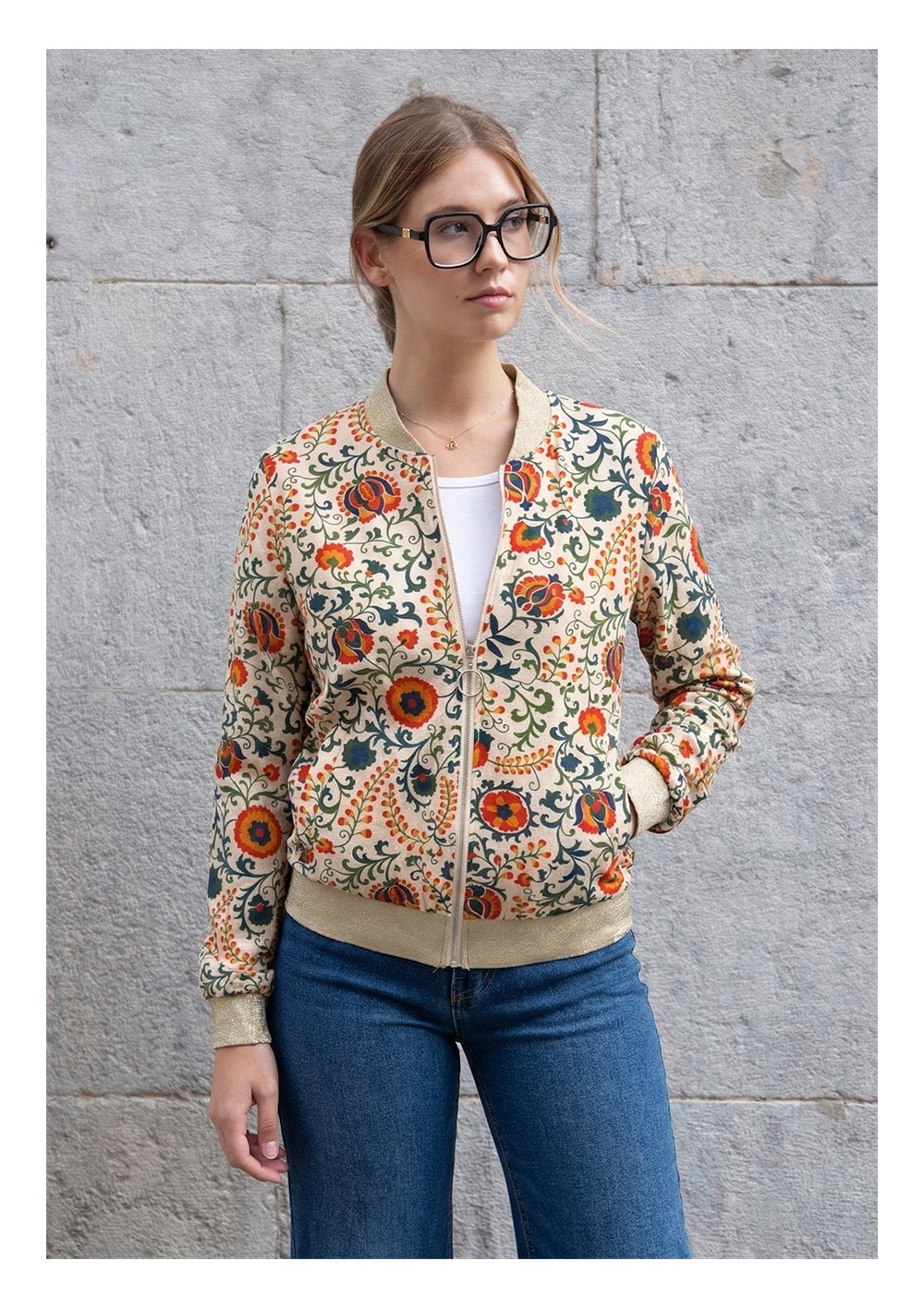 Lined bomber jacket. Lightweight fabric. Printed design with gold trim outlining the leaves. Contrasting metallic white elasticated knit collar, waistband, and cuffs. Silver-tone zip front closure .