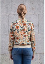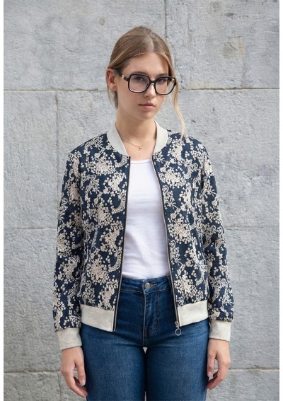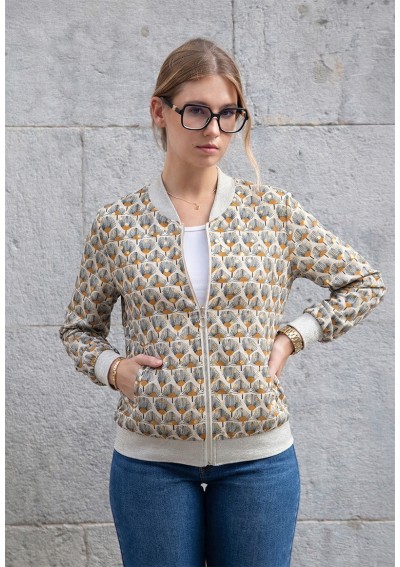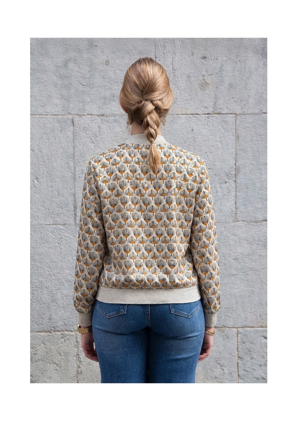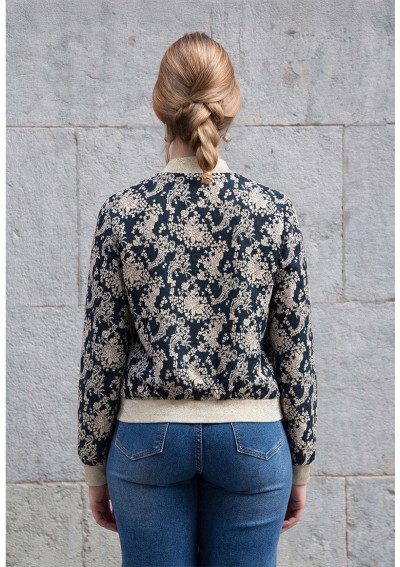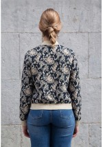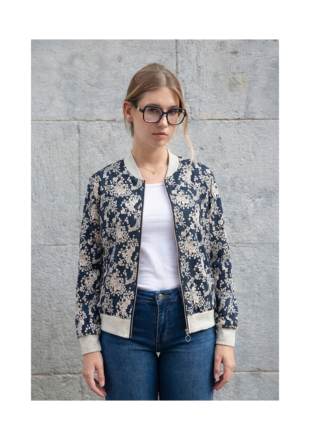 Lined bomber jacket. Lightweight fabric. Printed design with gold trim outlining the leaves. Contrasting metallic white elasticated knit collar, waistband, and cuffs. Silver-tone zip front closure .