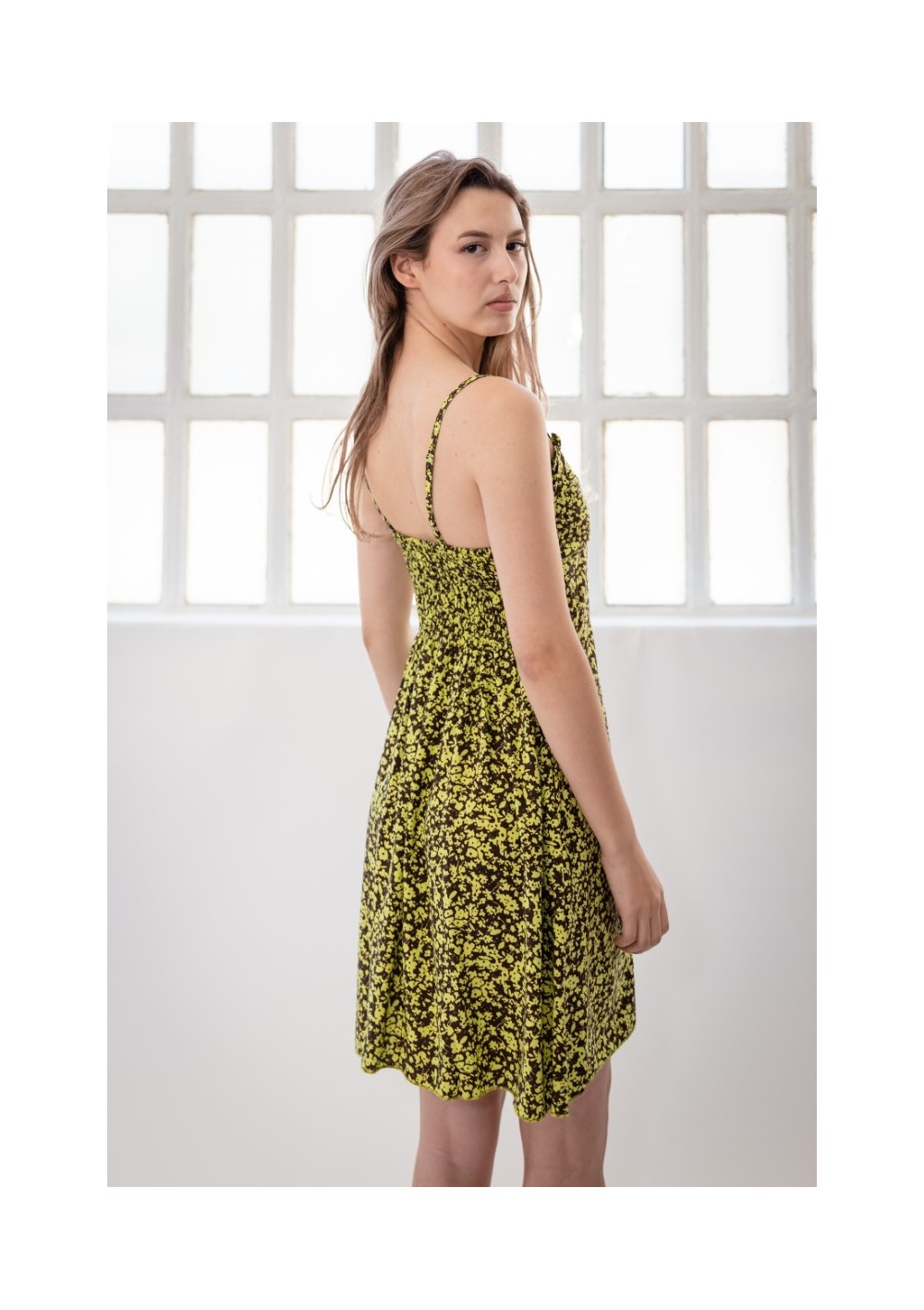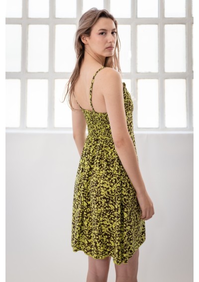 Printed dress in lightweight fabric with a deep V-neck and a mini ruffle at the hem. Adjustable straps. Elasticized back with smocked detailing. Fitted under the bust. Three decorative buttons. Lined bust. Side pockets.