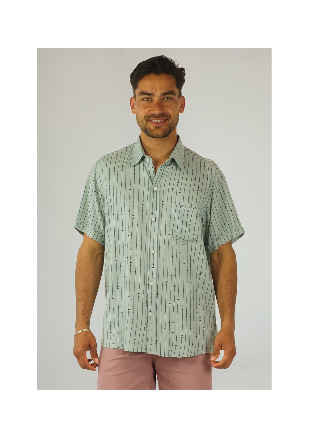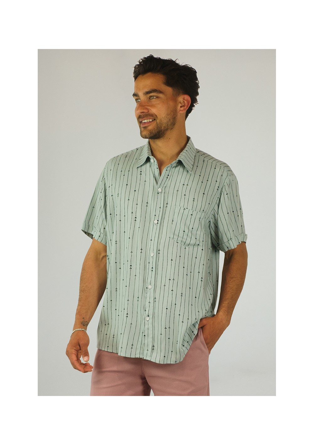 Regular fit. Mini vertical arrow print design on a pearl gray background. Back yoke. Button front closure.