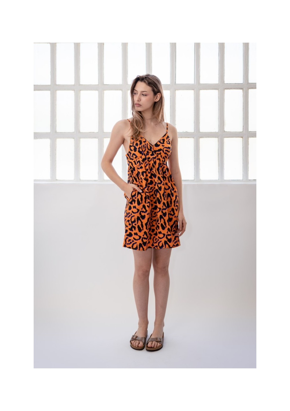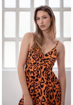 Abito stampato. Tessuto leggero con scollo a V e spalline regolabili. Schiena bassa con laccetto regolabile che si chiude con un fiocco o un nodo. Cucitura arricciata sotto il seno. Seno foderato. Tasche laterali. Gonna a trapezio.