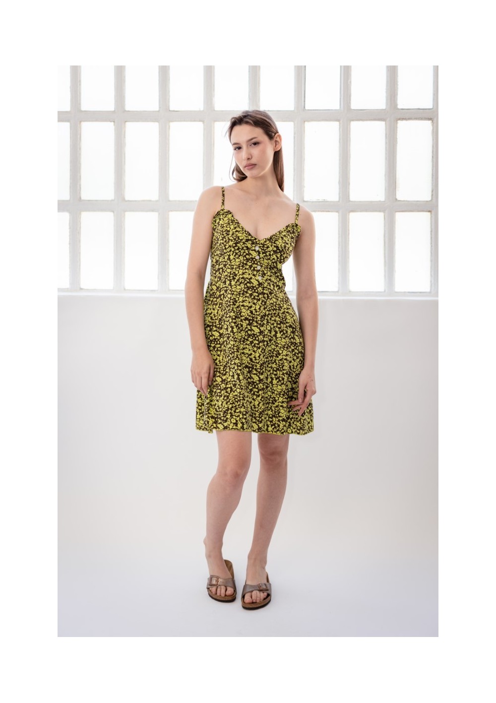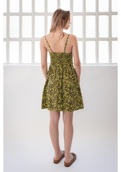 Abito stampato in tessuto leggero con profonda scollatura a V e mini volant sull'orlo. Spalline regolabili. Schiena elasticizzata con dettaglio smock. Vestibilità aderente sotto il seno. Tre bottoni decorativi. Busto foderato. Tasche laterali.