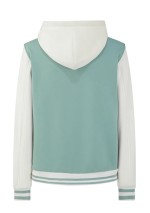 Felpa in stile college con fronte e retro verdi. Maniche, cappuccio e patte delle tasche beige. Polsini e orlo in maglia elasticizzata a contrasto con motivo a righe verdi su sfondo beige. Chiusura frontale con bottoni automatici verdi opachi.