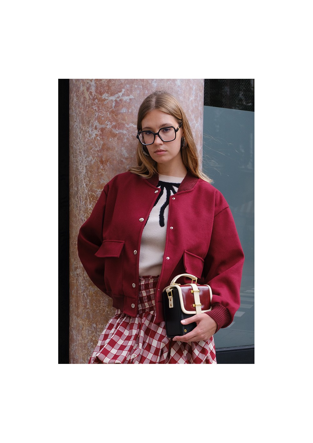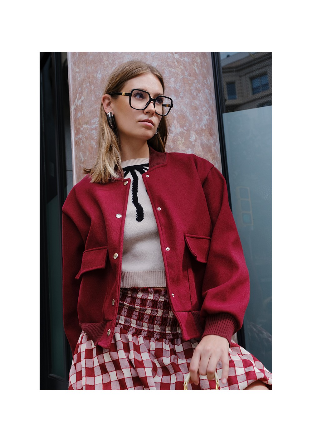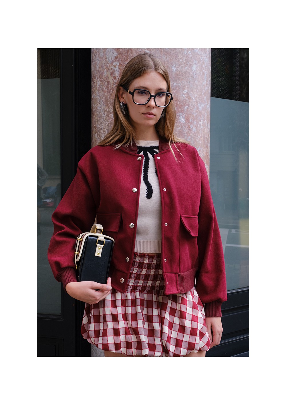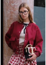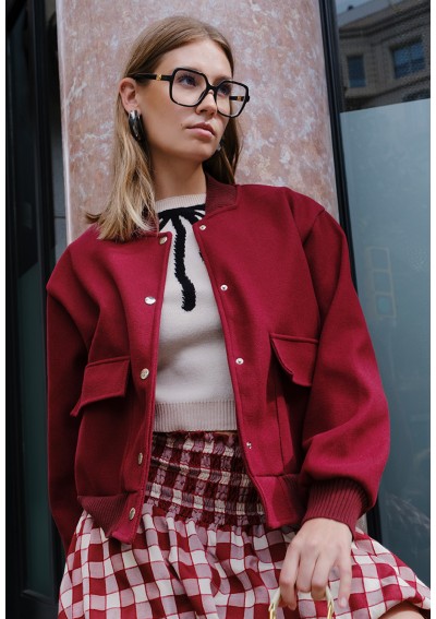 Bomber in lana sfoderato. Collo, orlo e polsini in maglia a coste nella stessa tonalità. Tessuto morbido, caldo e molto flessibile. Tasche quadrate applicate con patta. Chiusura frontale con bottoni automatici color argento.