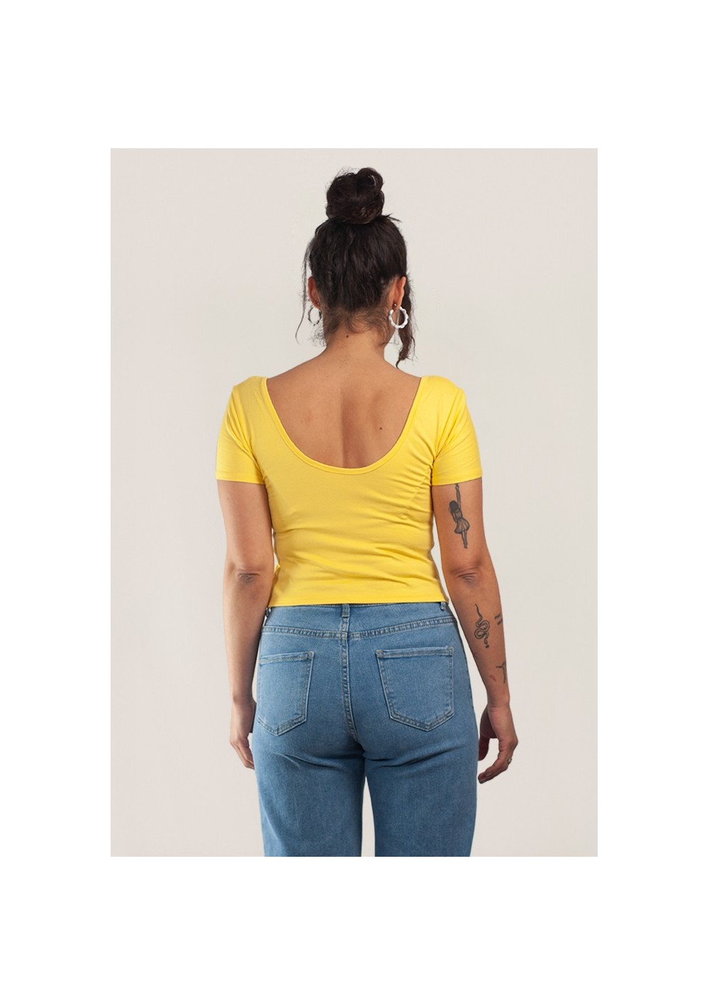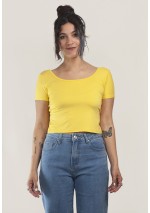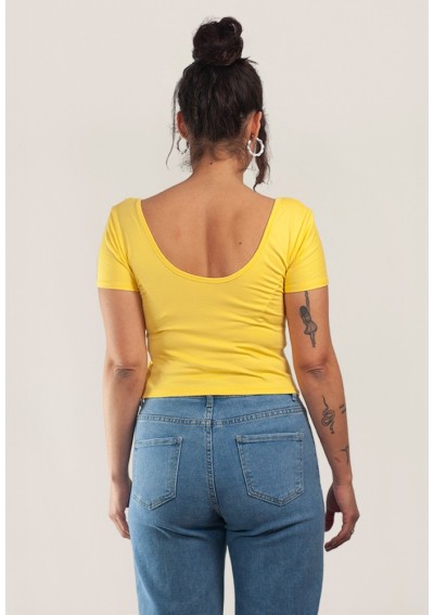 Top corto a maniche corte. Lunghezza fino alla vita. Scollatura profonda sulla schiena all'altezza del reggiseno.